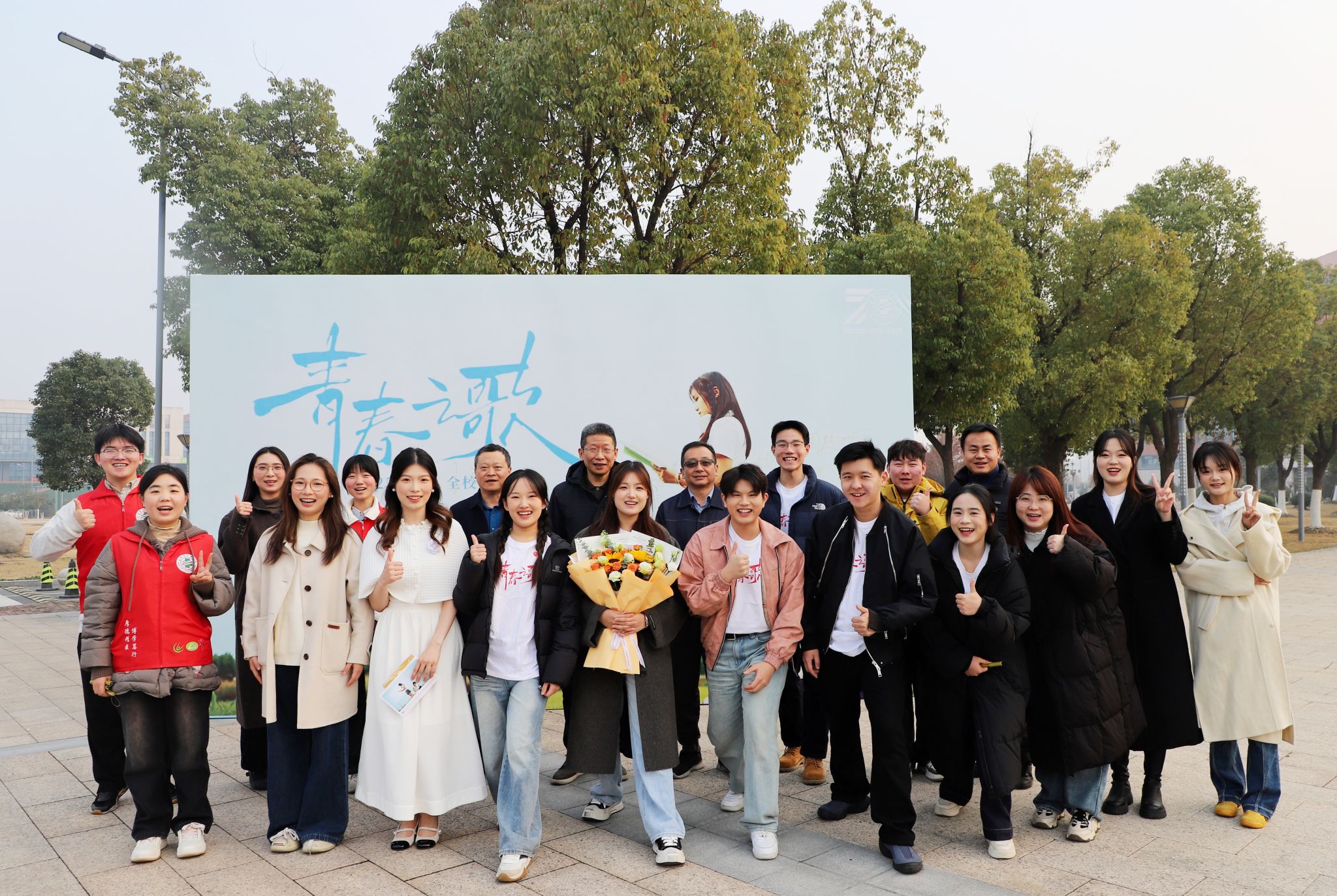 首映礼现场,,,,, ,,,印着“青春之歌响山河”字样的海报前热闹特殊,,,,, ,,,师生们纷纷提笔署名,,,,, ,,,以文字转达对学校七十华诞的真挚祝福与青春理想的优美期许。。。。。署名墙上,,,,, ,,,稚嫩笔触与成熟字迹交相辉映,,,,, ,,,恰如跨越时空的对话,,,,, ,,,呼应着影片“传承”的焦点主题。。。。。