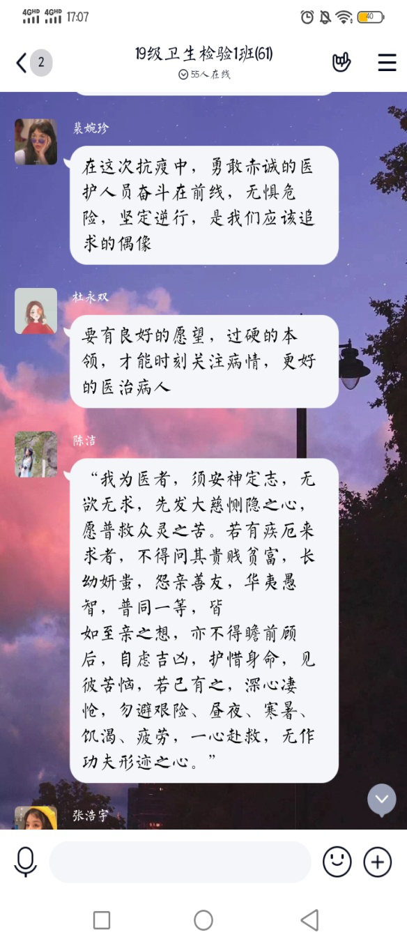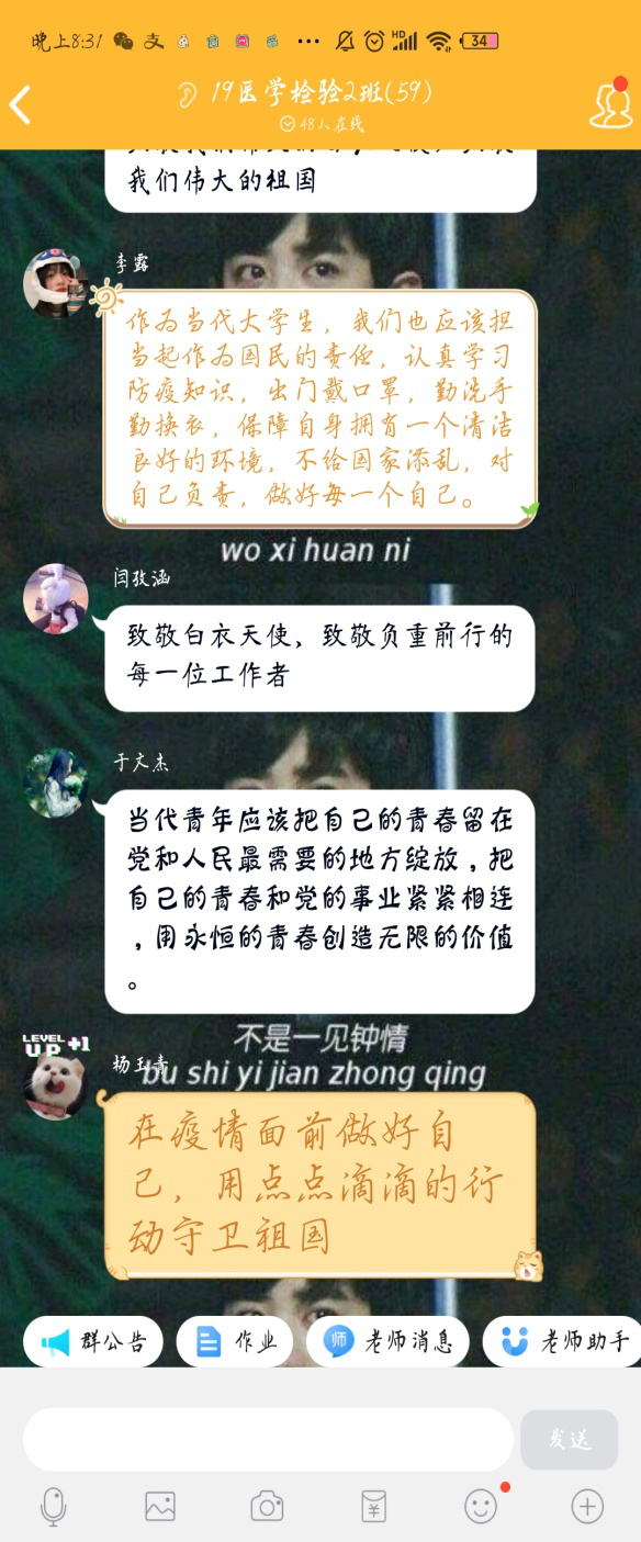 19预防医学班同砚们说:通过加入这次战“疫”思政大课的学习,,,,,让我们对生命价值有了更科学的认知,,,,,也真切感受到了我们伟大祖国的优势。。。。。这个春节给我们所有人上了一课,,,,,那就是“珍惜”。。。。。珍惜自己的生命,,,,,珍惜平安康健的日子。。。。。面临疫情,,,,,我们更应该做到“科学防疫,,,,,守护生命”,,,,,做一个有责任心的中国公民。。。。。做有继续的今世大学生!少年强则国强。。。。。在这场没有硝烟的战争中,,,,,有着许多年轻的身影,,,,,年轻的护士们,,,,,自愿者们,,,,,尚有为防疫事情作出孝顺的其他职员,,,,,他们逆行而上,,,,,他们有着对责任的继续。。。。。作为新时代新青年的我们,,,,,应绝不摇动的坚持党的向导!信心比黄金更珍贵。。。。。翻看中华历史卷轴,,,,,无数次瘟疫皆被化解;在社会制度云云优越、医疗手艺更为蓬勃的今天,我们越发坚信,,,,,党和国家拥有战胜-切艰难险阻的汽特殊能力。。。。。只要我们信托科学的实力,,,,,不造谣、不信谣、不传谣,,,,,坚定必胜信心,,,,,并将这个信心转达给身边的每一小我私家,,,,,我们就能一直汇聚打赢疫情防控阻击战的磅礴实力。。。。。信托用不了多久,,,,,我们就能“守得云开见月明”,,,,,摘下口置在阳光下自由呼吸。。。。。
