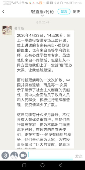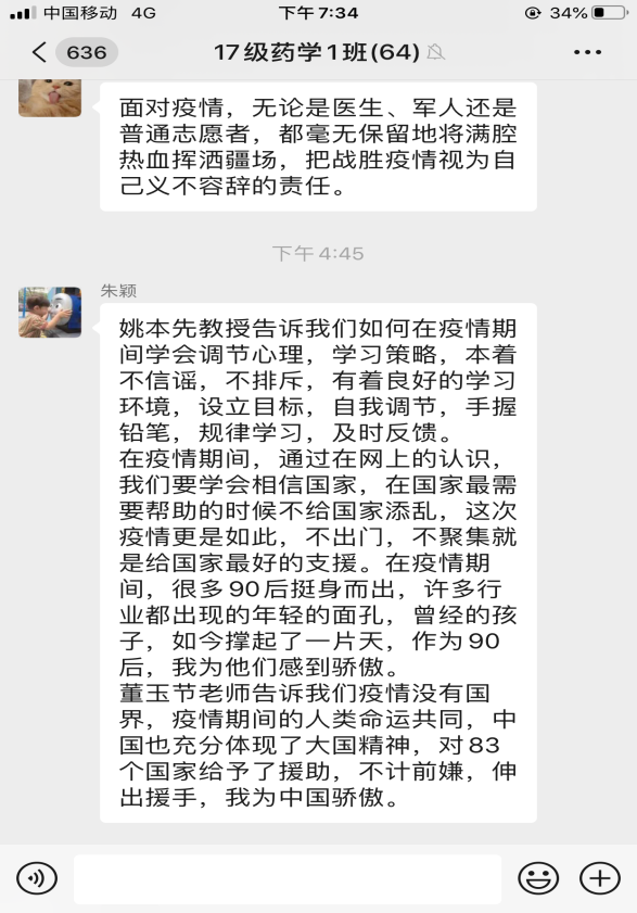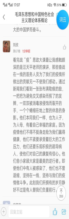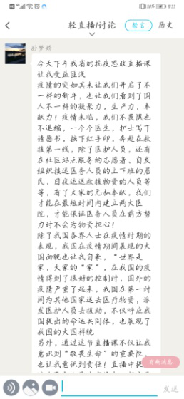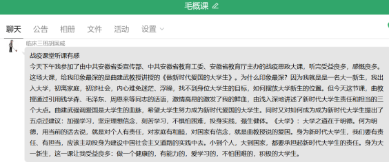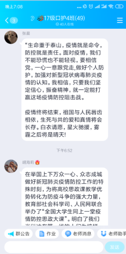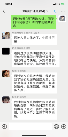 线上课程竣事后,,,,,思政课西席、向导员划分组织所带班级的同砚通过QQ群、云班课、学习通、雨课堂等平台睁开了热烈的交流和讨论,,,,,真切感悟逆行者的仁者情怀和中国的大国继续,,,,,深刻体会疫情防控中坚持党的向导的主要性和社会主义制度的优越性,,,,,深入明确中华民族爱国主义的精神内在。。。。。