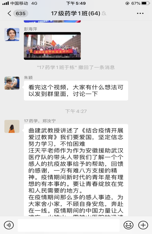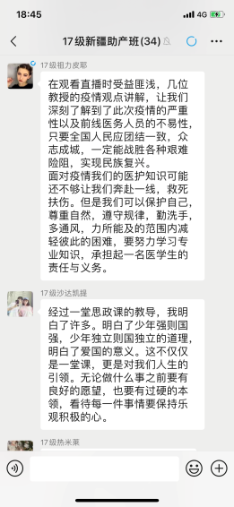 17级临床专业的同砚说:克日来,,,,,新冠肺炎疫情防控形势一连向好、生爆发涯秩序加速恢复、国际社会对中国此次疫情防控的行动也给予高度评价。。。。。董玉洁教授向我们提出“在战争中践行人类民运配合体”。。。。。人类民运配合体是人类生长的一定效果。。。。。病毒没有国籍,,,,,疫情也没有国界。。。。。在国籍社会受疫情肆虐情形下,,,,,中国首先捐赠出2000万美元来支持抗疫。。。。。现在,,,,,中国向127个国家和4个国际社会组织提供资助和支持。。。。。疫情眼前,,,,,天下人名应志同道合,,,,,才可取告捷利。。。。。通过本次学习,,,,,让我扪看到了祖国的强盛,,,,,国家的继续,,,,,党的支付,,,,,社会的温暖,,,,,越发坚信了走中国社会主义的蹊径是何等的准确。。。。。作为新时代的青年,,,,,我们应该增强自身的能力,,,,,为祖国和人民肩负一份责任。。。。。