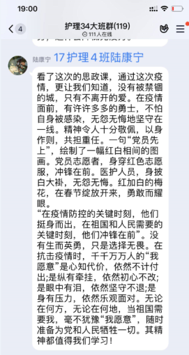 19级照顾护士本科班的同砚说:我们感动于疫情目今,,,,,国家仍不忘对dp体育官网(中国)官方网站体贴,,,,,对dp体育官网(中国)官方网站头脑、心理各方面做出了实时的指引和照顾。。。。。我们是被祖国敬重着的,,,,,而我们也终将成为祖国的自满和底气;;;;;;;疫情眼前,,,,,没有谁可以置身事外,,,,,作为一名医学生,,,,,现在我们能做的就是起劲学习,,,,,珍惜祖国、先进们为我们创立的牢靠生涯,,,,,用知识、能力回报祖国。。。。。