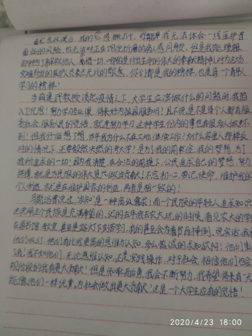 寓目了今天的这堂天下大学生疫情防控思政大课。。。。。我感伤万千,,,,,受益匪浅。。。。。己亥年尾,,,,,庚子之春,,,,,武汉大疫,,,,,染者数万,,,,,众恐惧。。。。。然,,,,,政者,,,,,医者,,,,,兵者逆行勇战,,,,,万民同心!硝烟不见胜硝烟,,,,,天使白衣冲在前!我为作为一名中国人而自满自豪,,,,,我感受到了天下上下拧成一股绳的强鼎实力,,,,,我为国家的步伐与目的而震撼!这是对国家对人民的磨练。。。。。在这次疫情,,,,,许许多多的九零后八零后,,,,,他们,,,,,担起自己的责任,,,,,奋战在一线。。。。。无惧危险,,,,,无惧生命。。。。。作为今世大学生,,,,,当尽己责,,,,,勤学苦读,,,,,以待他日报效祖国!最后愿山河无恙,,,,,人世皆安!